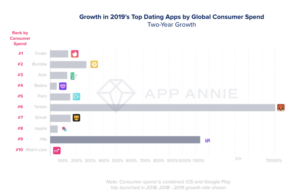 L’ultimo report di App Annie sullo stato della telefonia mobile ha mostrato come le dating app siano ormai diventate uno strumento estremamente popolare per trovare compagnia, con una spesa nel 2019 pari a 2,2 miliardi, il doppio di quanto si spendeva solo due anni fa.