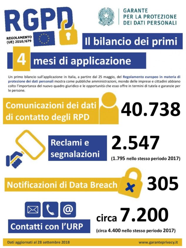 In quattro mesi dall’entrata in vigore del nuovo regolamento Ue sulla Data Protection, i reclami e le segnalazioni pervenuti al Garante Privacy in Italia sono stati 2.547, a fronte dei 1.795 pervenuti nello stesso periodo dello scorso anno.