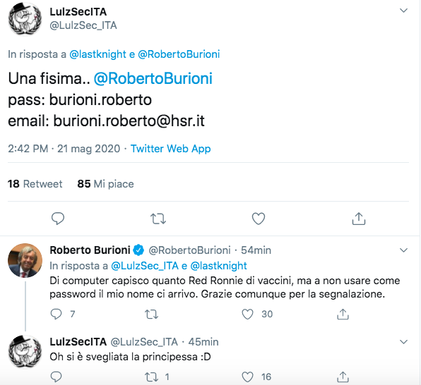 Tra le vittime dell’hack anche il virologo Roberto Burioni, che si difende con queste parole: “Di computer capisco quanto Red Ronnie di vaccini, ma a non usare come password il mio nome ci arrivo. Grazie comunque per la segnalazione“.
