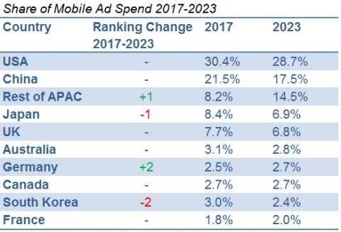 Attualmente, a trainare il mercato del mobile advertising è la regione Asia-Pacifico, con il 44% della spesa globale. Stati Uniti, Cina e Giappone sono i tre paesi in cima alla classifica della spesa in termini assoluti, anche se la loro posizione comincia a subire una frenata.