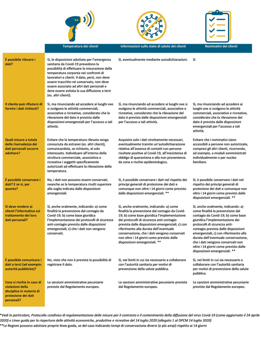L’infografica realizzata dal Garante per la protezione dei dati personali per ristoranti, attività turistiche, attività ricettive, commercio al dettaglio, centri sportivi, musei, autonoleggi, attività culturali e ricreative, cinema e spettacoli dal vivo, parchi tematici, sagre e fiere, terme e centri benessere, sale giochi e discoteche.